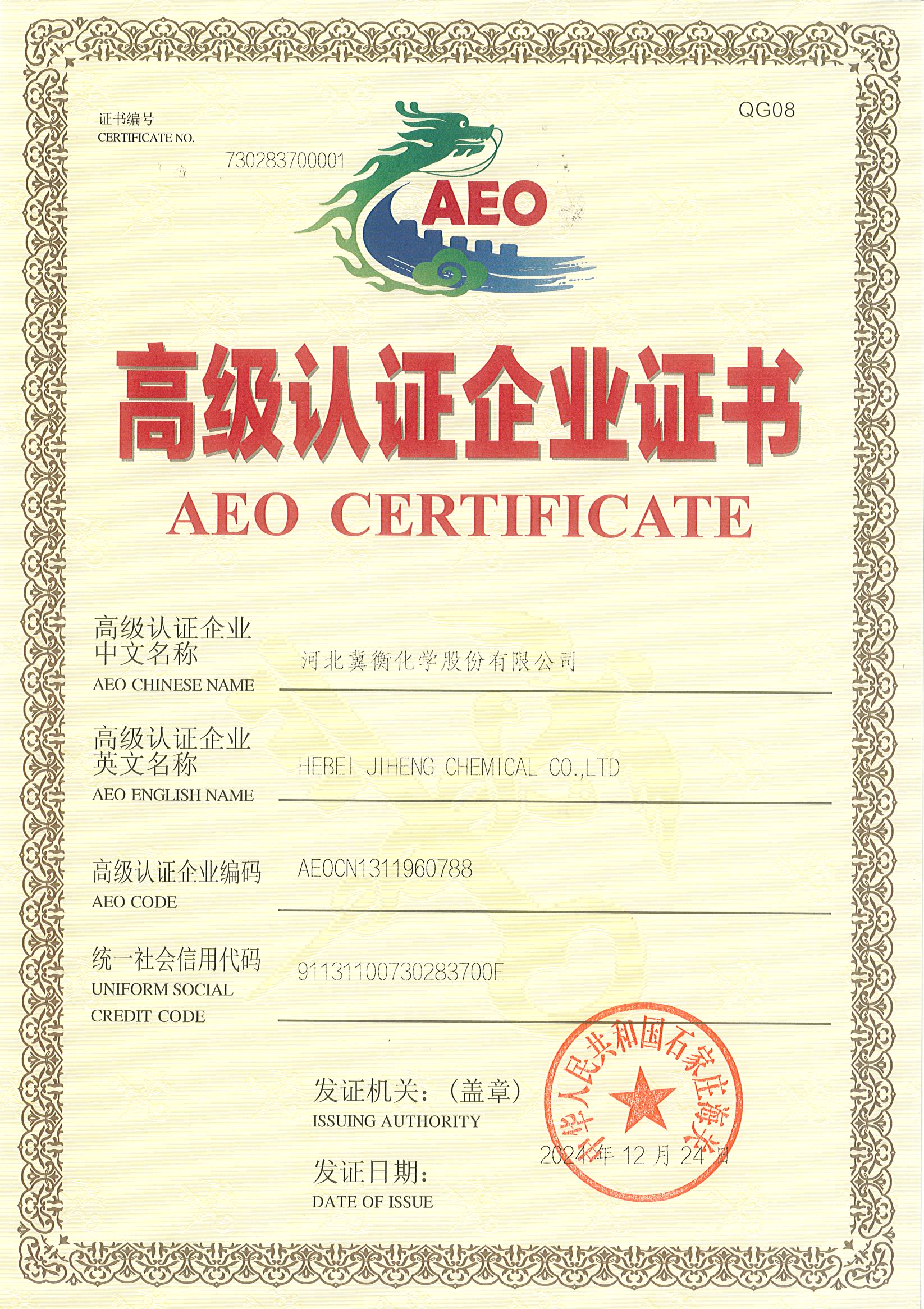 近日,河北冀衡化學(xué)股份有限公司取得了中華人民共和國石家莊海關(guān)頒發(fā)的《AEO高級認(rèn)證企業(yè)證書》,公司被認(rèn)證為AEO高級認(rèn)證企業(yè)。